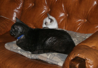 As the evening wore on there was still some chasing each other around and working out dominance things, but gradually the cats started to tolerate each other. Late in the evening they were relaxing on the couch and Simcoe walked over to Caligula's pillow and camped out next to him:
