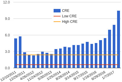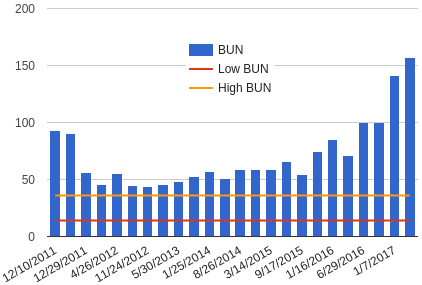 I've put a copy of the spreadsheet with exact levels up here, the BUN and CRE tabs include what the normal values are from the lab (these vary between labs).