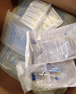 Box of fluids, IV sets and needles